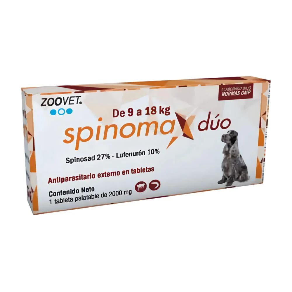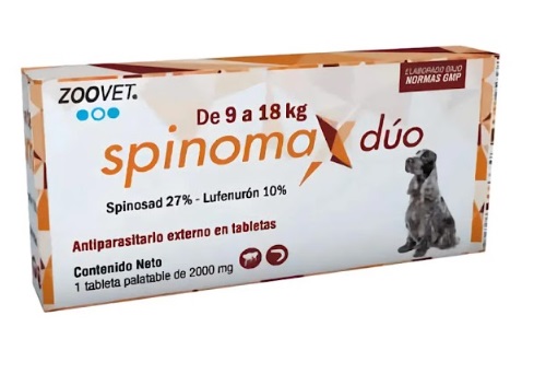 El Spinomax Dúo para perros de 9 a 18 kg es un antiparasitario oral de rápida acción que elimina pulgas adultas y previene su reproducción en el hogar durante 30 días.